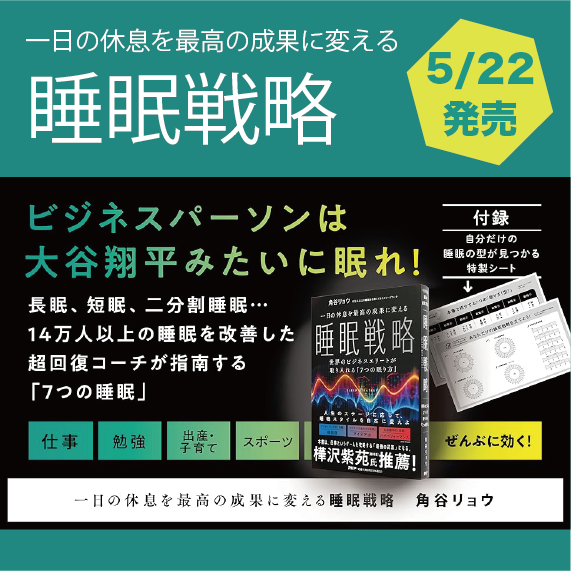 2024-04 『一日の休息を最高の成果に変える睡眠戦略』角谷リョウ著(PHP研究所)amazon予約開始 文章構成を担当した『一日の休息を最高の成果に変える睡眠戦略』角谷リョウ著(PHP研究所)amazonでの予約がスタートしました。 2024-04-06 | Posted in news | Comments Closed
